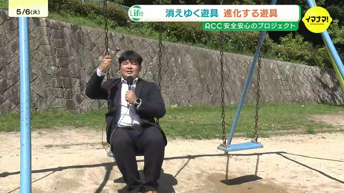 「ブランコといえば、チェーンでこのように腰掛けるタイプが昔は一般的でしたが、今はどんどん変わってきています。」