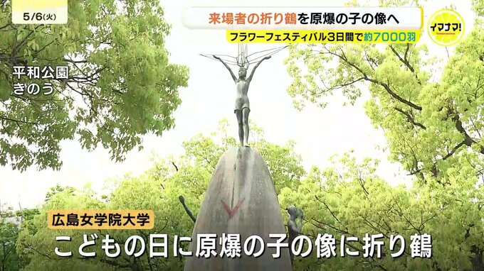フラワーフェスティバルの期間中、来場者が折った鶴7000羽が、原爆の子の像に捧げられました。5月5日のこどもの日に原爆の子の像に折り鶴を捧げるセレモニーを開いたのは広島女学院大学の学生です。鶴は学生たちが…