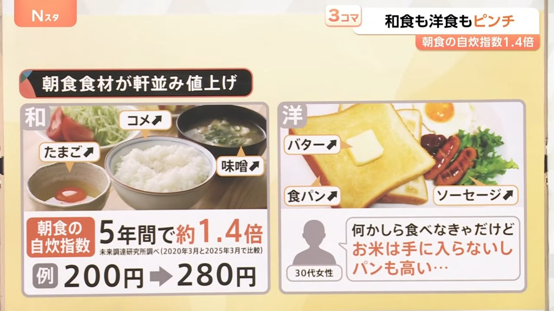 未来調達研究所によりますと、朝食を自炊することで、どれくらいコストが上昇しているかを示す「朝食の自炊指数」は5年間で約1.4倍にも上昇しているということです。(2020年3月と2025年3月で比較)