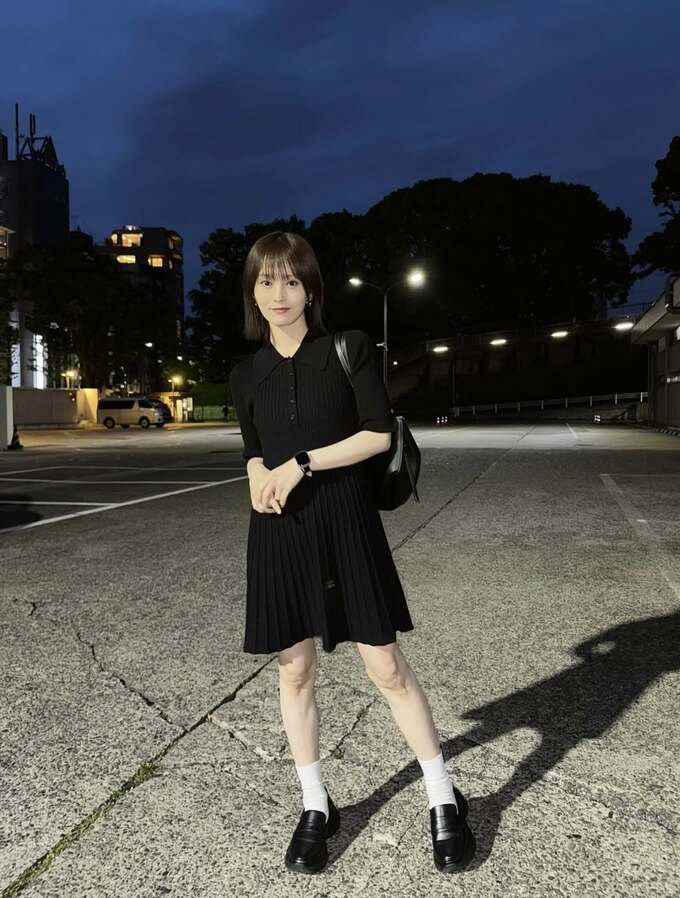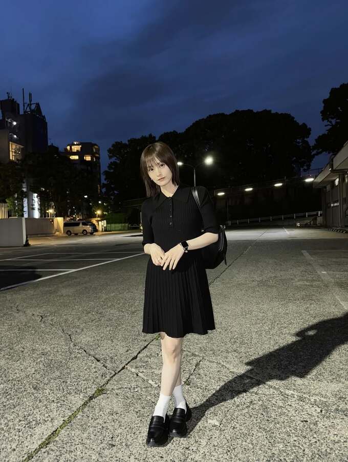 山本さんは、日が落ちた駐車場らしき場所をバックに、街灯を照明代わりにして撮影。「私服でスカートほんとに履かなくなったから」「たまーに履くとなんか恥ずかしいよね」とテキストしつつ、「スカート」と言いながら、黒の半袖リブのワンピースを着ているように見えます。