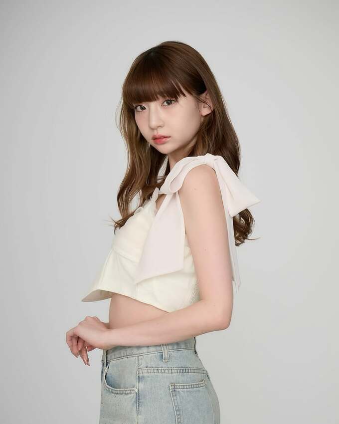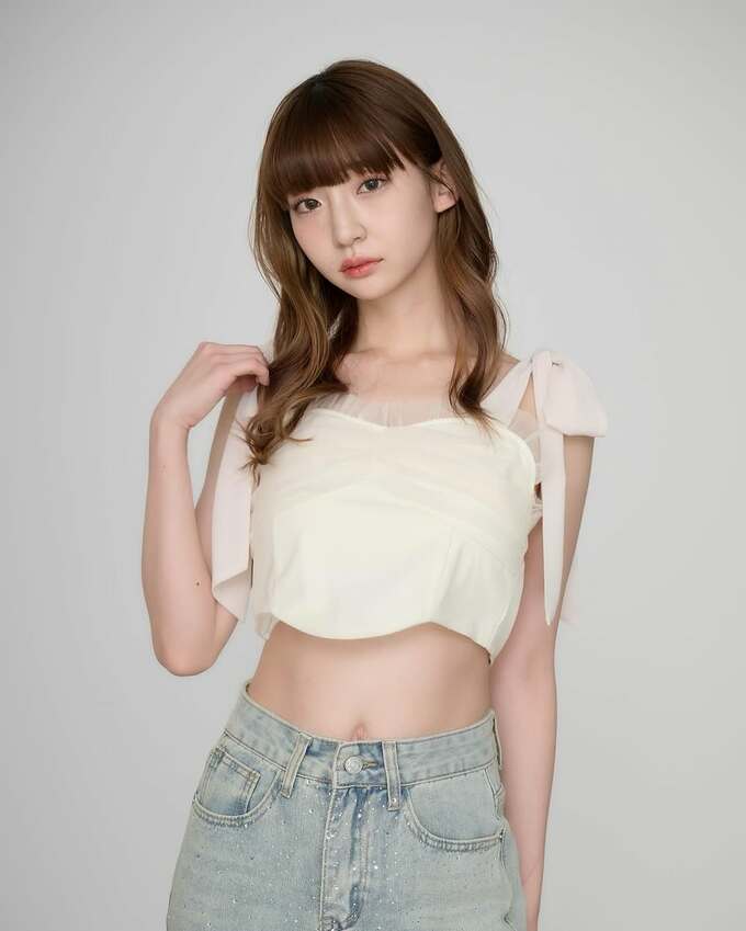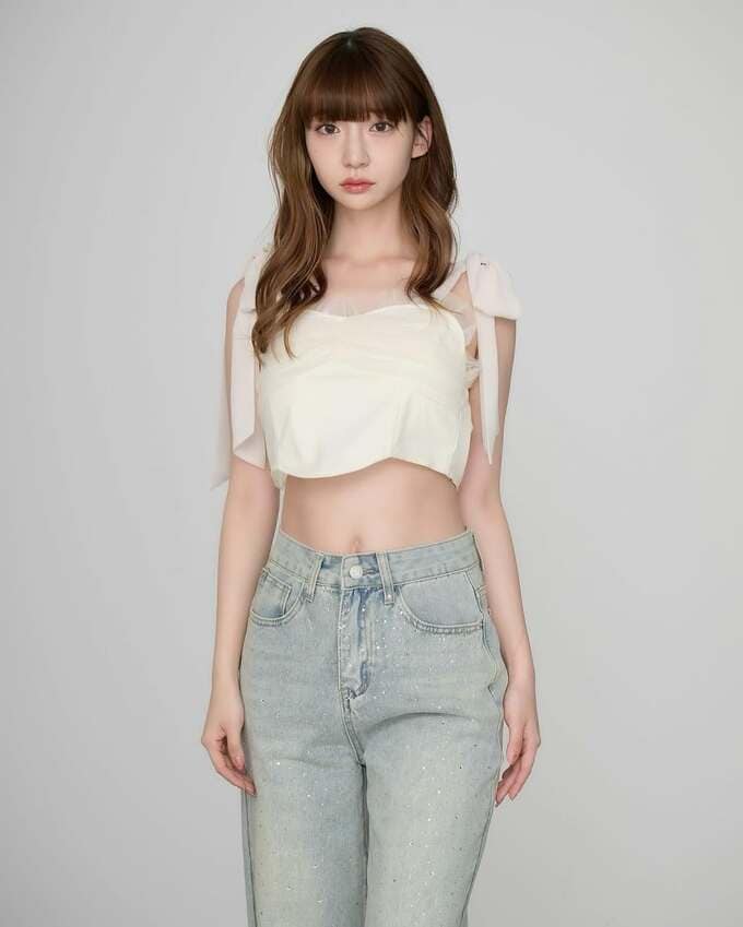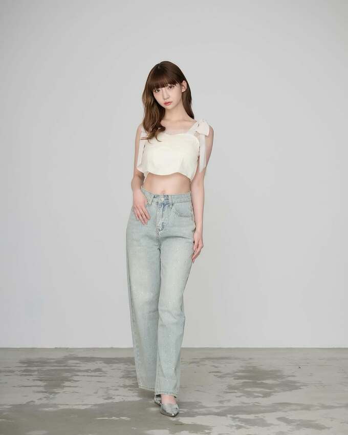 肩には淡いピンクのリボンのデザインがあしらわれ、シンプルながらも女性らしさを引き立てっており、トップスはクロップ丈で、ハイウエストのデニムパンツとのコーディネートとなっています。