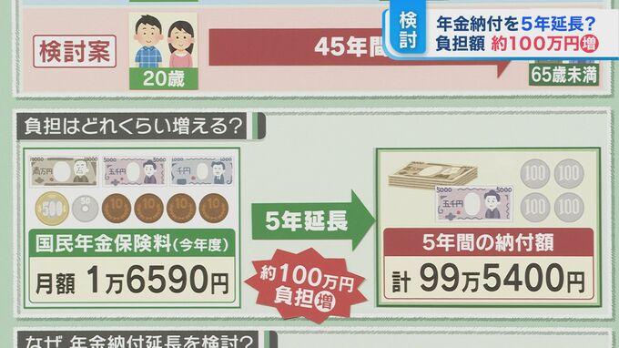 国民年金の納付期間を5年延長し、65歳になるまで納める案が検討されています。現行の納付額で計算すると、約100万円負担が増えることに。