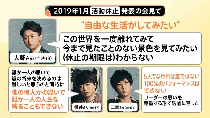 2019年1月、活動休止発表の会見で、大野智さん(当時38歳)は、“自由な生活がしてみたい”ということ、「この世界を一度離れてみて、今まで見たことのない景色を見てみたい。(休止の期限は)わからない」と話していました。