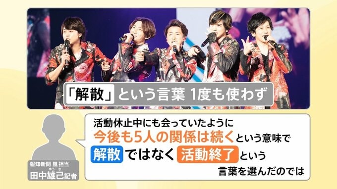 報知新聞 嵐担当 田中雄己記者は「事実上の解散だけれども、思いとしては、活動休止中にも会っていたように、今後も5人の関係性は続くという意味で、解散ではなく活動終了という言葉を選んだのではないか」としています。