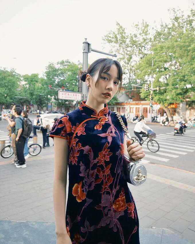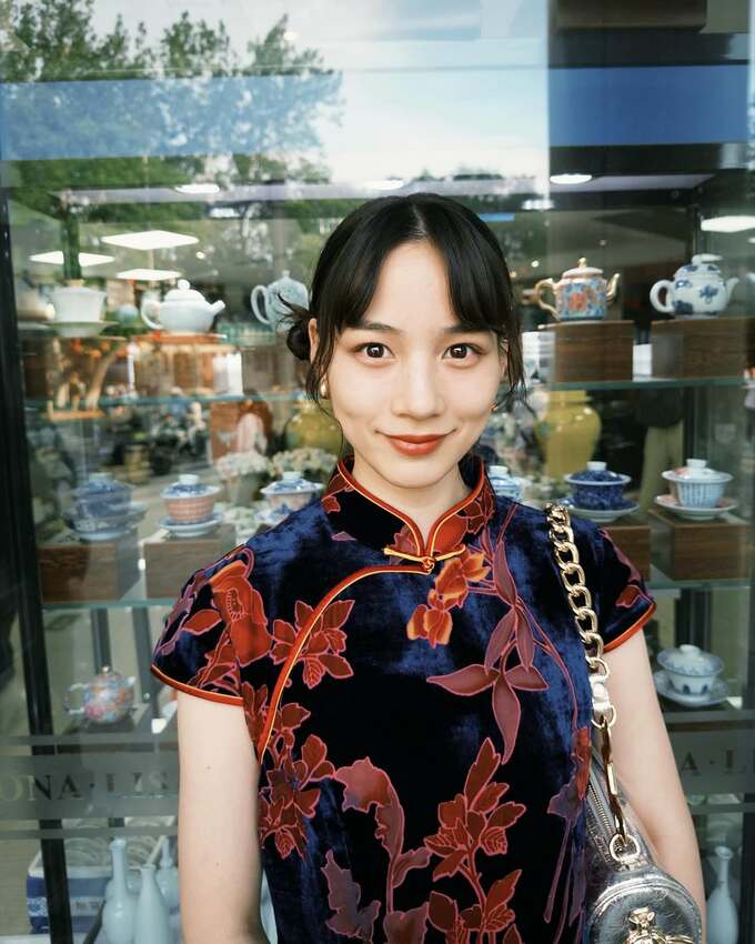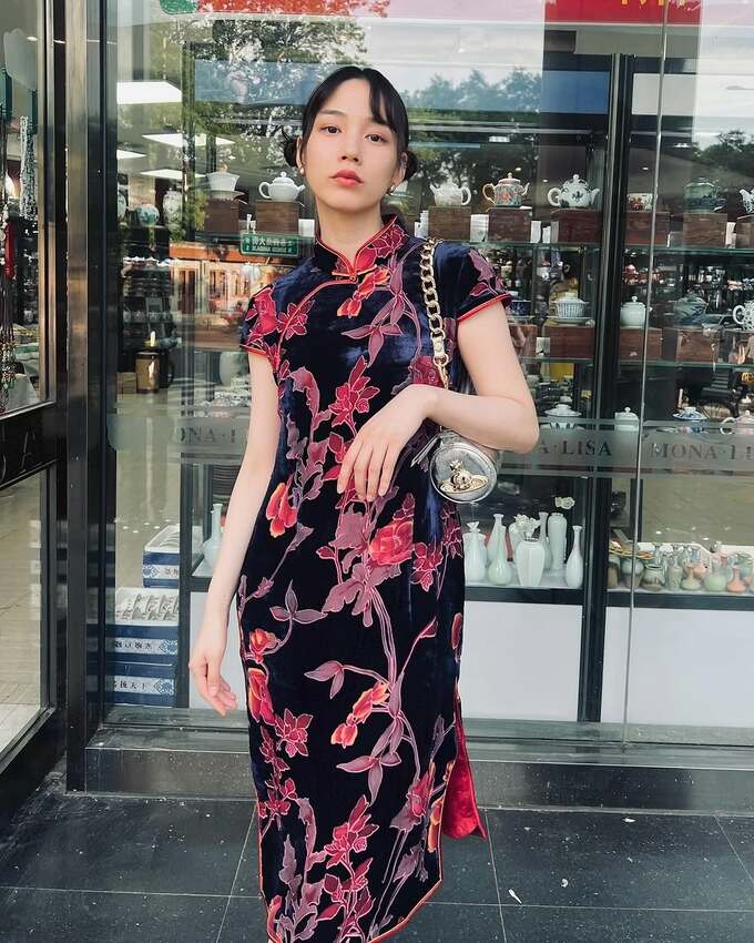 投稿された写真には、陶磁器が並ぶショールームの前で紺色を基調とした、オレンジ色や紫色の植物の柄が入ったチャイナドレスをまとい、街ブラする様子をとらえています。