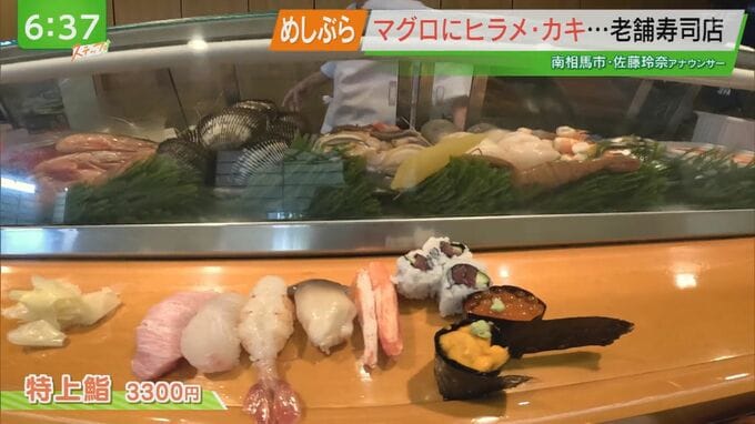 そんなユーモア溢れるご主人が握るお寿司がこちら!最上級の特上寿司。この日のネタは、トロ、相馬で水揚げされたヒラメとホッキ貝、ボタンエビ、ウニなど贅沢に8種類。さらにお吸い物付きです。まずは本マグロのトロから・・・