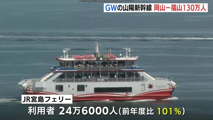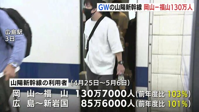 JR西日本によりますと、先月25日から今月6日までのゴールデンウィークに、山陽新幹線の岡山ー福山間を利用した人は、130万7000人。広島ー新岩国間は85万6000人でした。
