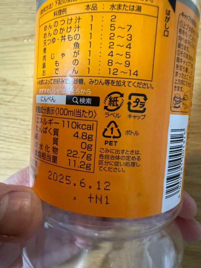 滝沢さんは、めんつゆのラベルに「PETマーク」がボトル・「プラマーク」がキャップ・「紙マーク」がラベルに相当するよう記されている様子も投稿。