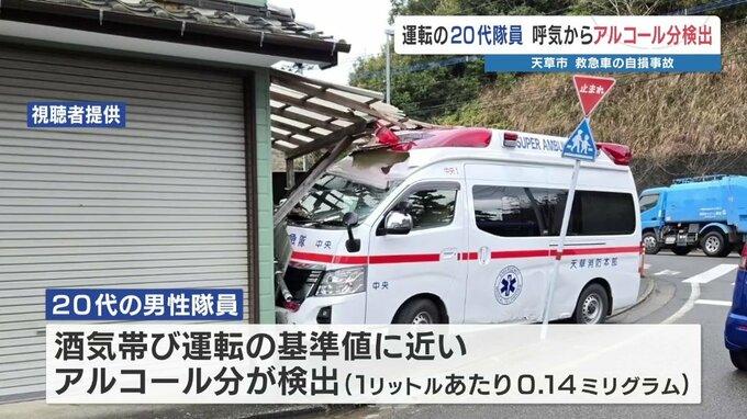 天草広域連合消防本部によりますと、この事故によるけが人はいませんでしたが、事故後に警察がアルコール検査をした結果、救急車を運転していた20代の男性隊員の呼気から、酒気帯び運転の基準値(呼気1ℓあたり0.15㎎)に近いアルコール分「0.14㎎」が検出されていたということです。
