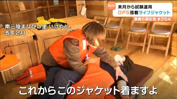 こちらは、福祉施設の入所者の避難を想定した実験です。用意した3種類の形のライフジャケットのうち羽織る形のものは30秒ほどで着用することができました。