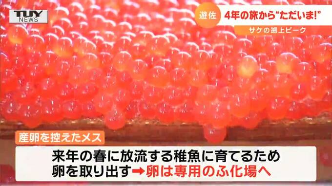 丸々と大きく育った、サケ。長い旅を経て、山形県遊佐町の滝淵川(たきぶちがわ)にサケが産卵のため帰ってきました。作業が行われているのは枡川鮭漁業(ますかわさけぎょぎょう)生産組合の採捕場(さいほじょう…