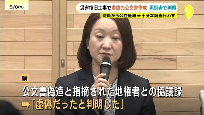 8日の会見で県は、再調査の結果、災害復旧工事をめぐって職員から公益通報で公文書偽造だと指摘されていた地権者との協議録が、虚偽だったと判明したと明らかにしました。今後、再調査に第三者も加えて、結果を改めて報告するとしています。
