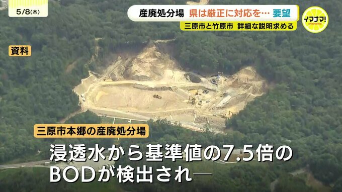 三原市本郷にある産業廃棄物処分場では、浸透水から基準値の7.5倍となる有機物による汚染が検出され、去年11月、県は廃棄物の搬入と埋め立てを中止するよう警告しました。