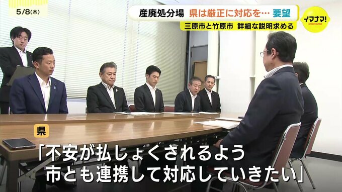 これについて、三原市の岡田吉弘市長と竹原市の新谷昭夫副市長が県庁を訪れ、基準値超過の原因究明を求める要望書を提出しました。要望書では、「原因が確認されない状況で廃棄物の搬入と埋め立てが再開されたことは、関係住民などの不安を増大させる」としています。