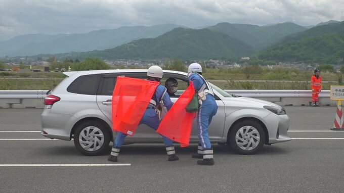 訓練は衝突事故を避けるためパトカーと高速道路の巡回車が一般車両を先導して現場に到着し、発煙筒を炊いて通行止めにして逆走車に停止を呼びかけます。