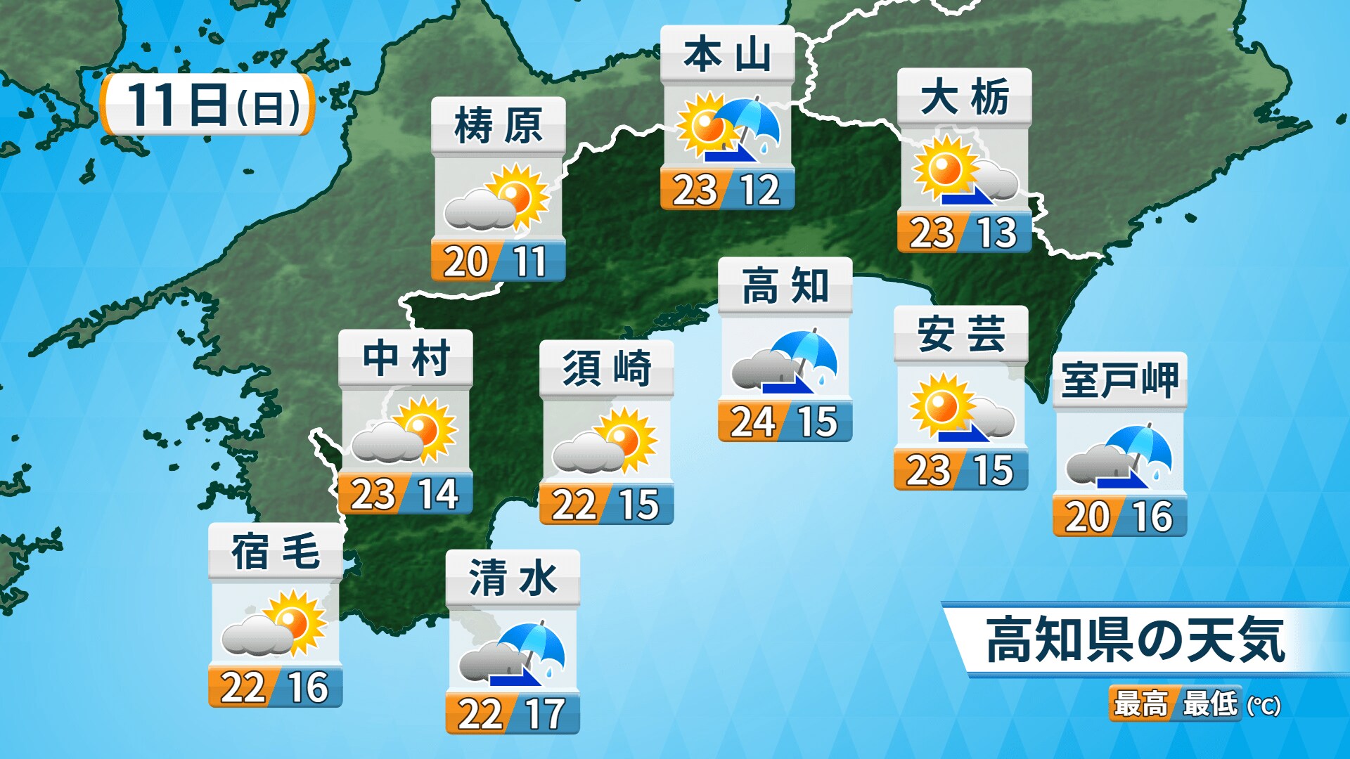 11日の県内は雲が多く広がり、日差しを感じられる時間が少なくなりそうです。平野部を中心に、昼過ぎから夕方にかけてにわか雨となるところがあるでしょう。気温は平年並みとなりそうです。