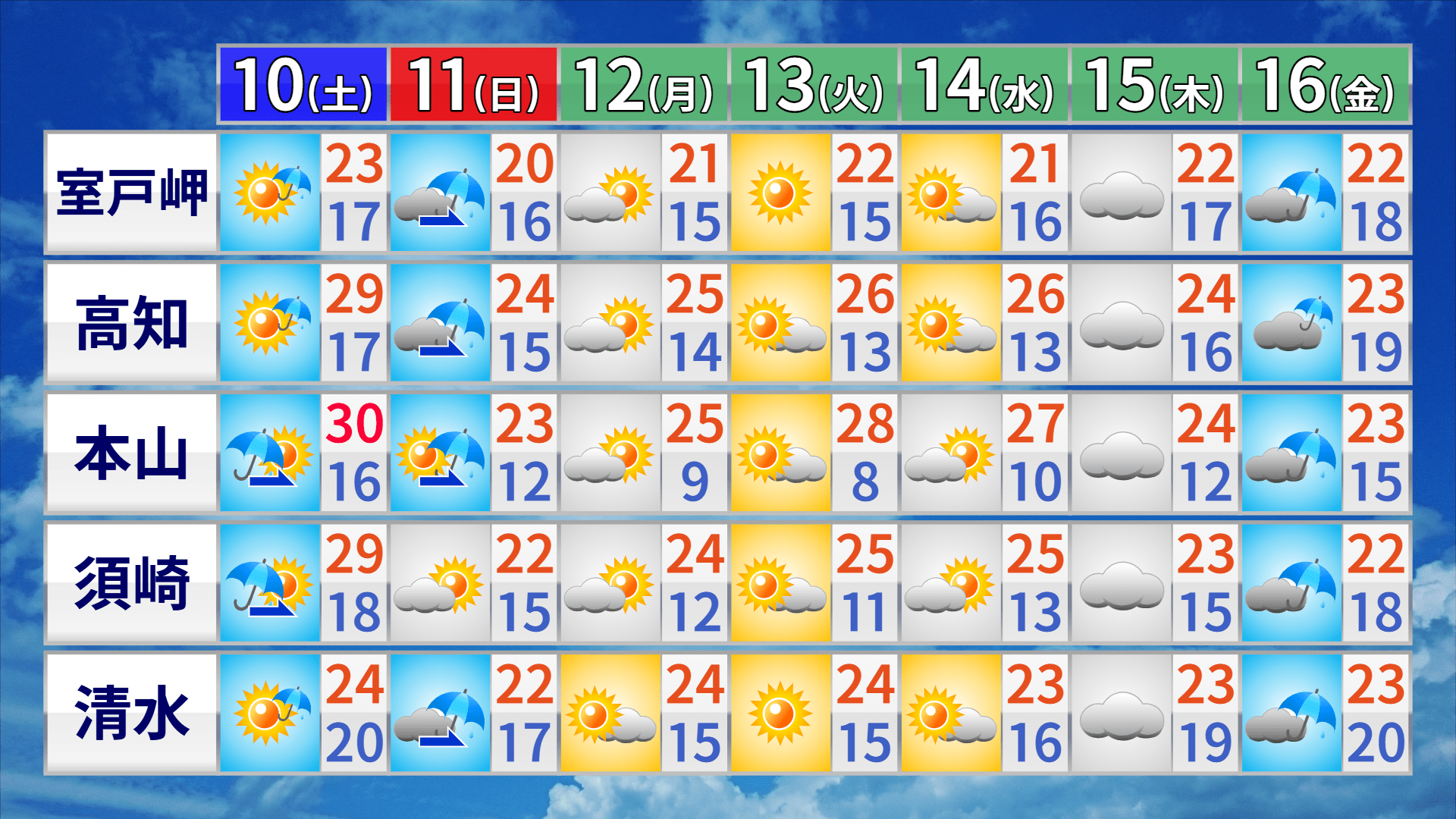 13日、14日は高気圧の張り出しにより気温が上がり、夏日となるところが多くなりそうです。一方で、山沿いでは寒暖差が広がる日も多くなりますので注意をしてください。16日は前線の影響で雨が降るでしょう。