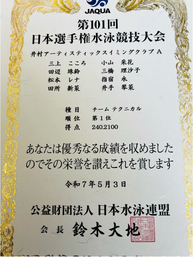 シンガーソングライターのダイアモンド✡ユカイさんが、自身のブログを更新。ダイアモンド✡ユカイさんの長女ニーチェこと新菜さんが、5月に行われる「第101回日本選手権水泳競技大会」アーティスティックスイミングのテクニカルルーティンで優勝したことを報告しました。