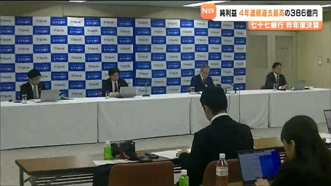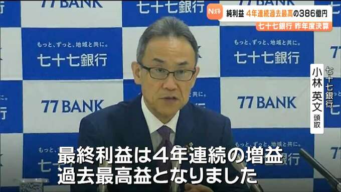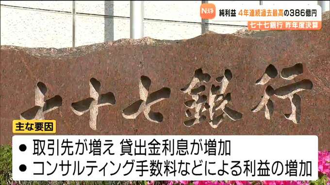 七十七銀行の2024昨年度の決算は、3年連続の増収増益で純利益は385億8800万円で4年連続で過去最高額を更新しました。