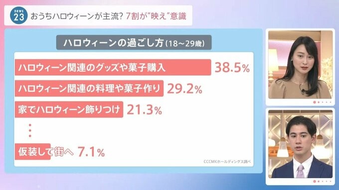 出かけるよりも自宅で楽しむ人が多そうです。また、ハロウィーン関連グッズなどを買うときに7割の人がSNS映えを意識していると。