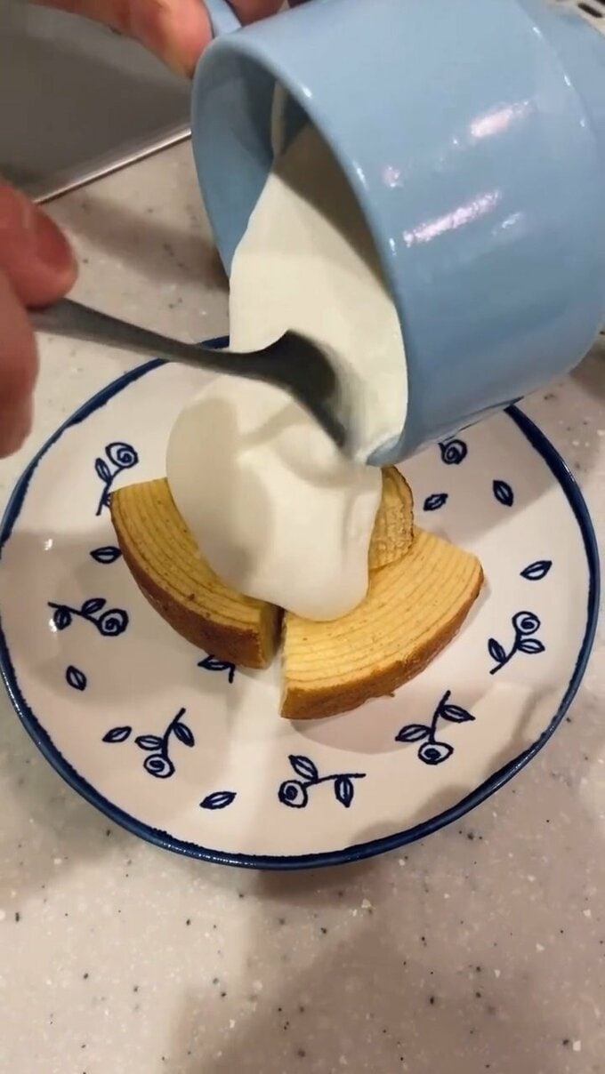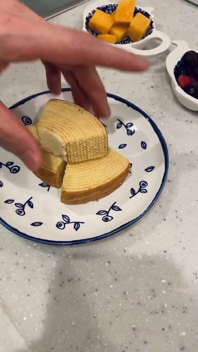 次に一口大に小さく切ったバウムクーヘンを小皿に軽く積み上げておきます。