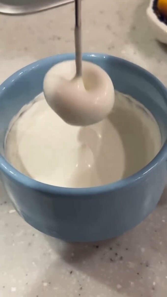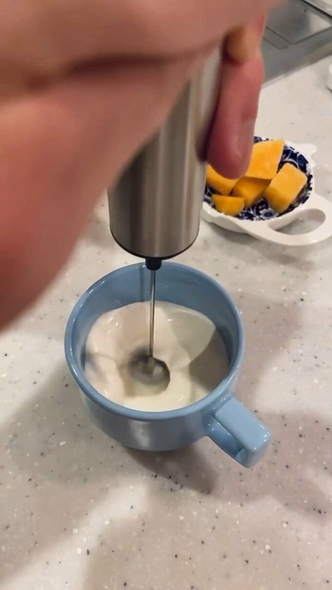 そしてパックから生クリームをカップに注いでフォーマーで軽く泡立て。さらに少量の砂糖を加えてさらに泡立てを続け、ふわふわのホイップになるまで続けます。