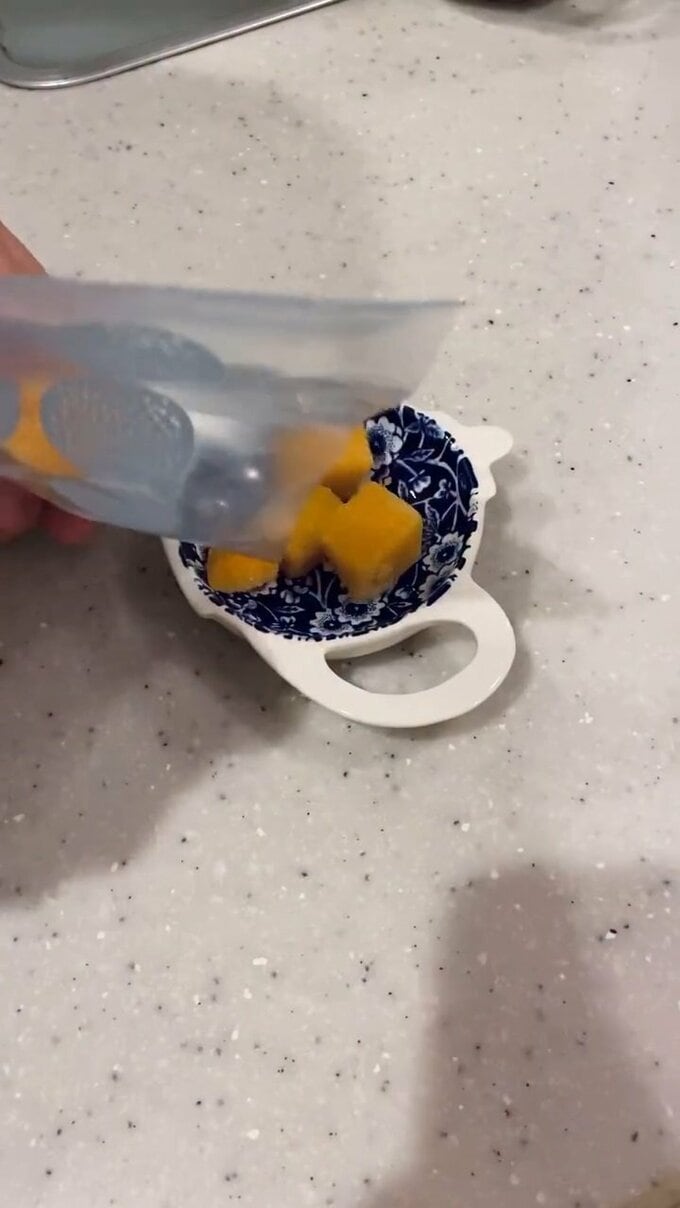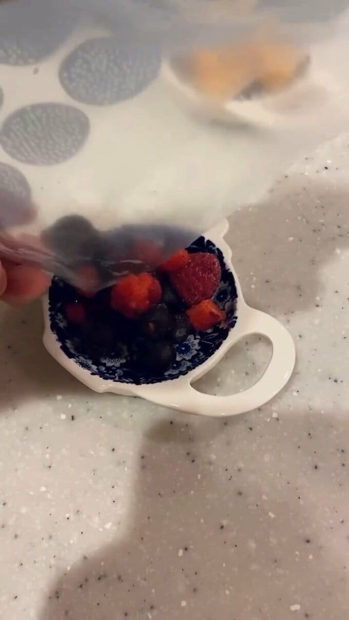 遠藤さんはまず、ダイス状にカットされた冷凍マンゴーと、冷凍ベリー類をそれぞれ小皿に出して自然解凍。