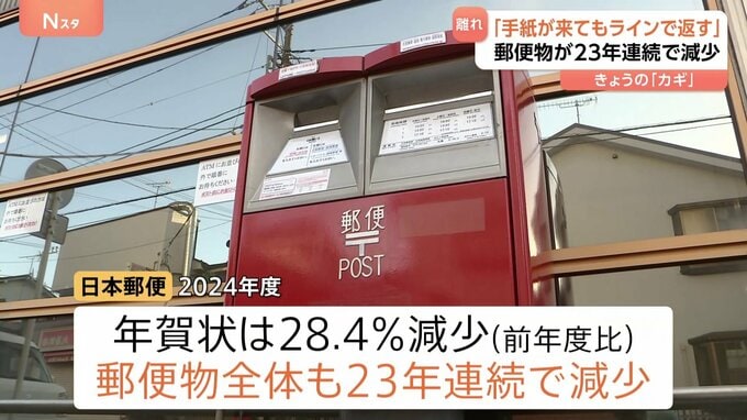 SNSの普及で郵便物の数が23年連続で減少、「切手の貼り方に自信がない…」という若者もいるようです。日本郵便はきのう、2024年度の年賀状が前年度に比べておよそ3割減ったと発表。郵便物全体の数も23年連続で減少…