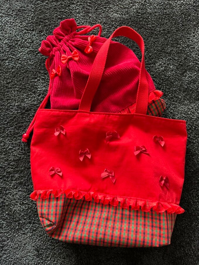 北川さんは「お着替えを入れる袋を新たに作りました」と、写真と共に報告。赤い布に、赤い小さなリボンと、赤いフリルが付いた、赤づくしの手作りの袋を公開しました。