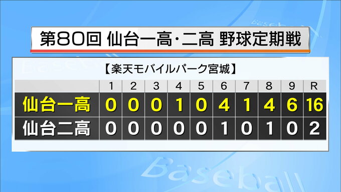 仙台一高と仙台二高の硬式野球定期戦が10日、仙台市の楽天モバイルパーク宮城で開かれました。1900年に始まった伝統の一戦は、「杜の都の早慶戦」とも呼ばれています。今回は戦後80回目となる節目の定期戦で、熱い戦いがくりひろげられました。その結果、仙台一高が16対2で仙台二高に勝ちました。これで両校の通算成績は完全な記録が残る戦後では、仙台一高が37回の優勝、対する仙台二高が32回の優勝となりました。