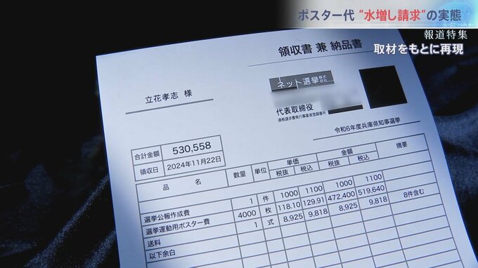 立花氏とネット選挙株式会社との間で交わされた知事選の領収書を確認し再現したものには、ポスター1枚あたりの単価は税込み129円91銭と記されていた。