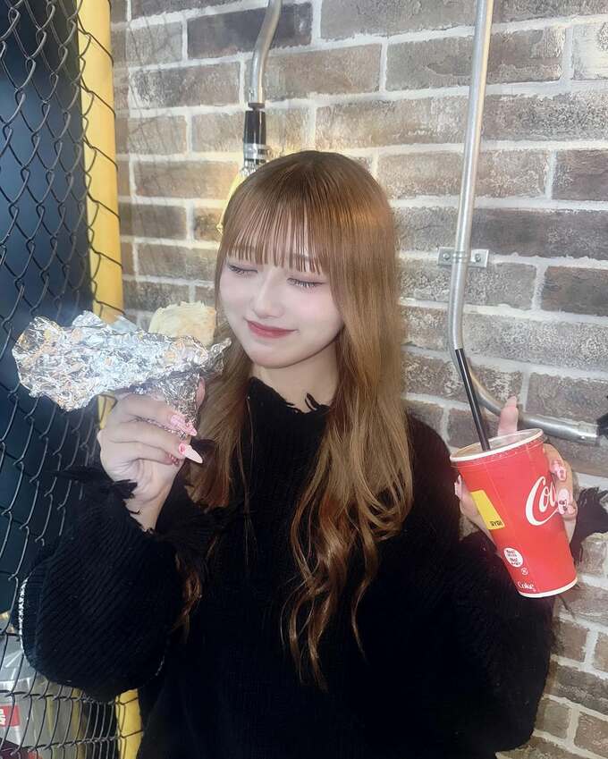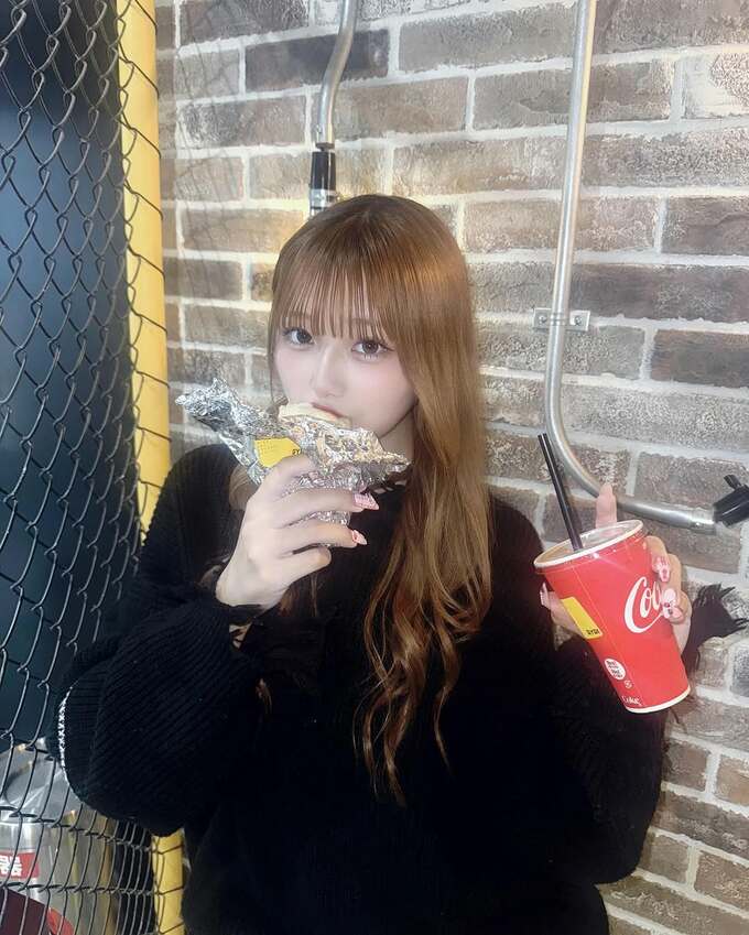 投稿された画像で、レンガ造りの壁を背景に、希空さんは黒いセーターを着て、長い茶色の髪を自然に流しています。希空さんの手には、アルミホイルに包まれたブリトーがあり、もう一方の手にはコカ・コーラのロゴが入った赤いカップを持っています。