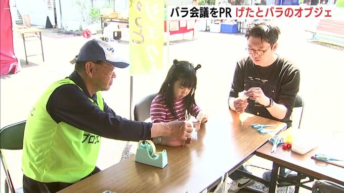 これまでバラづくりのワークショップが23回開かれ、およそ2千本を作りました。この日、参加者が下駄に最後のバラを差し込んで、完成しました。