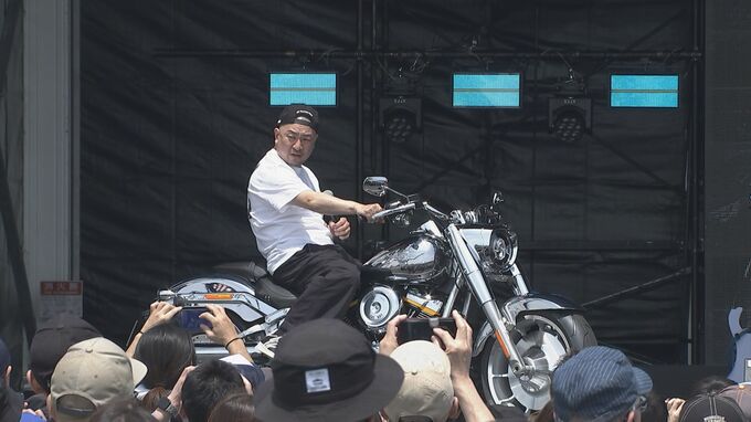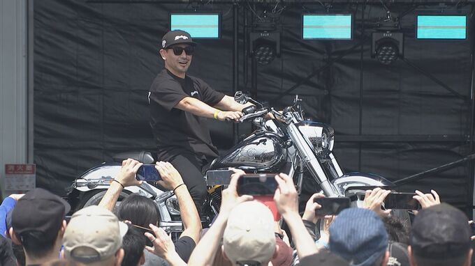 現在、「ローライダーST」と「ブレイクアウト」の2台ハーレーオーナーでもある魔娑斗さんは前日発表され、ステージに展示されたプレミア復刻シリーズ「アイコンコレクション」の「ファットボーイ🄬グレイゴースト」を見つけると“これ、シュワちゃんがターミネーターで乗ってたやつですよね”と目を輝かせシートをまたぐと“いいですね、これ。安定性あって、真っすぐぶっ飛んでいくでしょうね”と語り、司会から購入を勧められると悩ましい表情を浮かべ、“3台目を・・・”と、つぶやいていました。