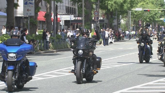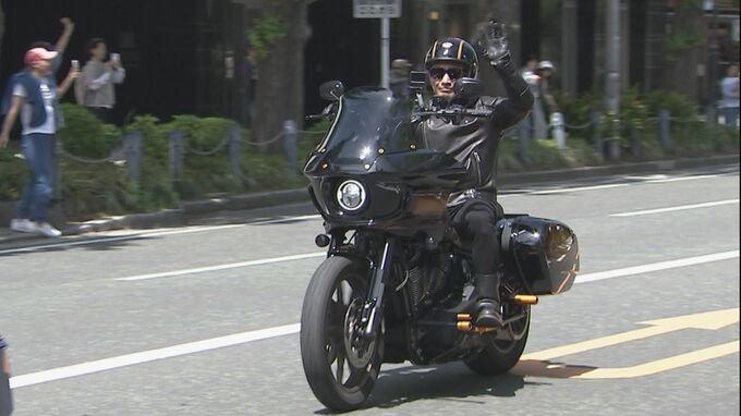 この日、午前中に山下公園通りで行われたハーレー300台による交通安全祈願パレードには、魔娑斗さんが愛車のハーレー(ローライダーST)にまたがり、自身がプロデュースするバイク用の衣装を身に着けてパレードの先導を務めました。