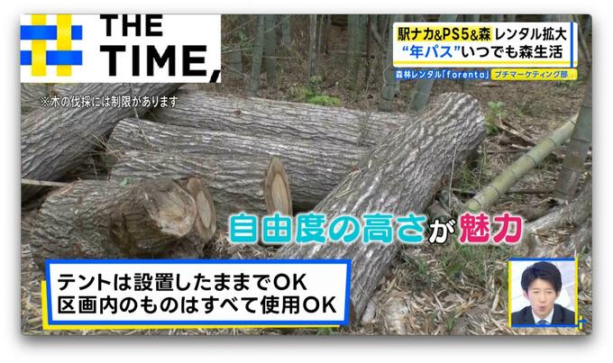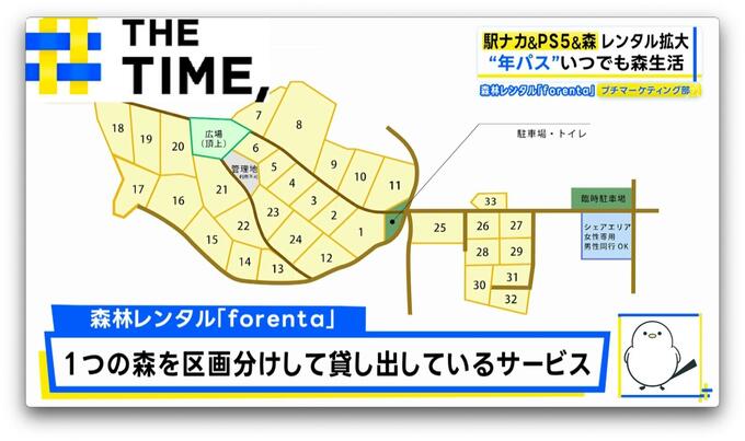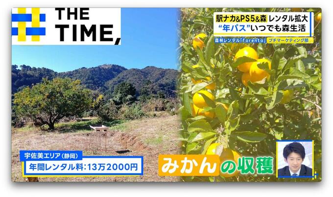 静岡県の「宇佐美エリア」(年間レンタル料:13万2000円)では“みかんの収穫”ができたりと森によってシチュエーションは様々で、特に人気なのが千葉県の「富田エリア」(年間レンタル料:7万7000円~9万9000円)だといいます。