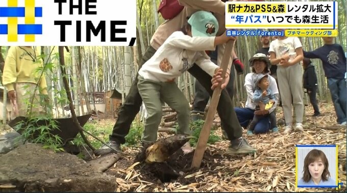 街の公園では味わえない体験ができるのが魅力とのことで、森に生えている「タケノコ」を掘ってその場で調理も。借りている区画内ならタケノコ堀りもOKです。