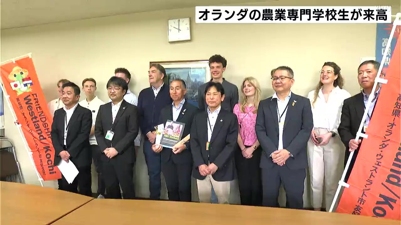 高知県を訪れたのはオランダにあるウェストラント市農業専門学校レンティス校に通う学生6人と教員2人です。県は先進的な環境保全型の農業に取り組むウェストラント市と2009年に友好園芸農業協定を結んでいて学生同士の交流を続けています。オランダからの訪問は9回目で、松村晃充(まつむら・あきみつ)部長は「交流を通じてオランダと高知の絆を深めてほしい」と歓迎しました。学生たちは5月19日までの11日間、農業技術センターや県内の農場を視察するほか、紙漉き体験などを行い、文化も学ぶことになっています。
