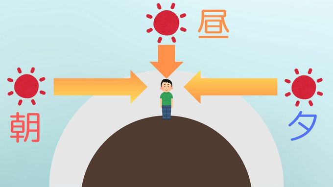 朝と夕方、太陽が低くなります。地球の空気を通って紫外線が差し込んでくるので紫外線自体は弱まるのですが、顔にまともに当たったり、目にまともに入ってきたりするので朝や夕方も注意が必要です。