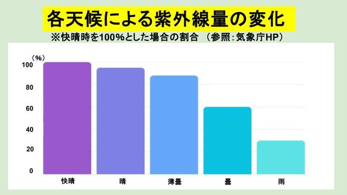 快晴時を100%とした場合、晴れの時ももちろん紫外線は強いのですが、薄曇りでも晴れとほとんど量が変わりません。また雨でも紫外線がまったくなくなることはありません。