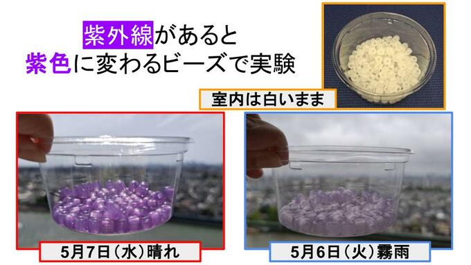 紫外線にあたると「紫色」に変化するビーズで実験してみると、室内の紫外線がないところでは白いまま。晴れている日ははっきりと紫色に変化し、霧雨が降る薄暗い日でも薄い紫色に変化しました。