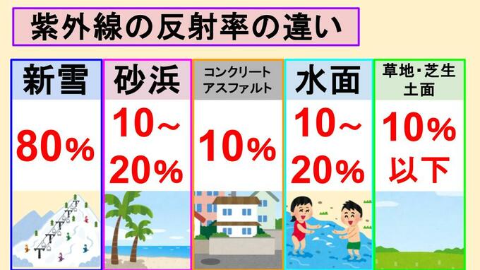 「紫外線」の反射率(照り返し)が強いのはどこ?