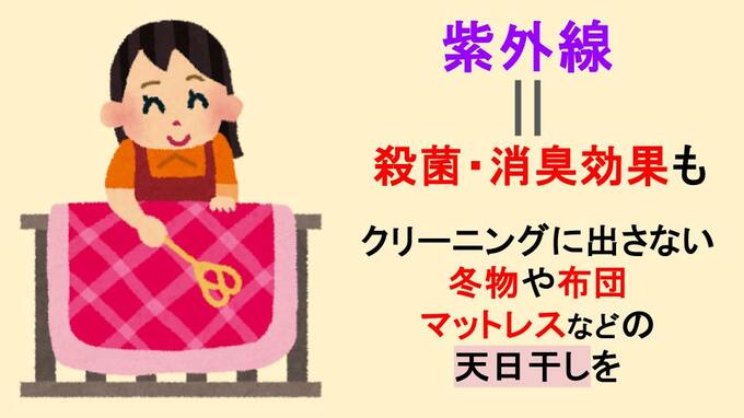紫外線には殺菌効果や消臭効果があるので、晴れた日にクリーニングに出さない冬物や布団、マットレスなどの天日干しをしてみてはいかがでしょうか。