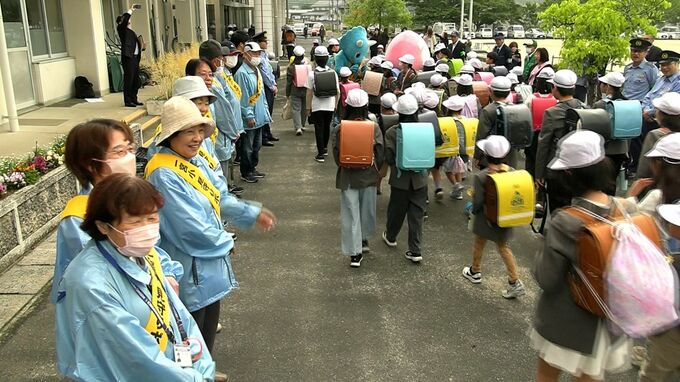 津山市の一宮小学校では、10人の民生委員が登校する児童に声をかけ、安全を見守りました。