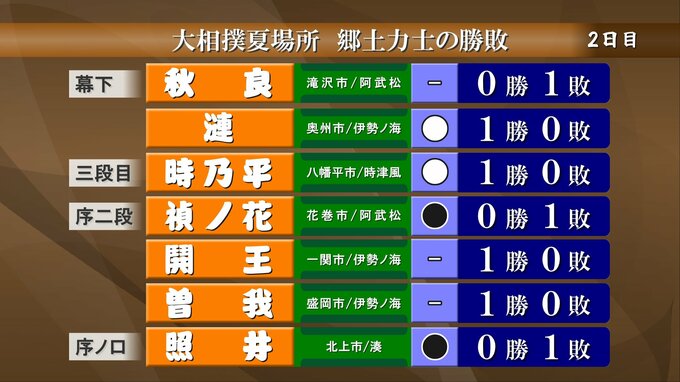 大相撲夏場所二日目の郷土力士の取り組みの結果です。