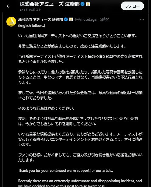 アミューズ法務部は「いつも当社所属アーティストへの温かいご支援をありがとうございます」と、挨拶すると、「当社所属アーティストが他社アーティスト様の公演を観覧中の姿を盗撮されるという事件が起きました」と、非常に残念なことが起きたと報告しました。