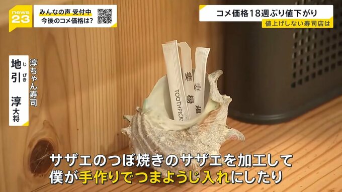 「サザエのつぼ焼きのサザエを加工して僕が手作りでつまようじ入れにしたり。備品なくなるんですよ、意外に。やっぱりお客さんの負担になるので値上げはしたくない」