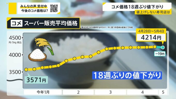 そんな中、農林水産省が12日に発表した全国のスーパーでのコメ5キロあたりの平均価格(税込)は、前の週より19円安い「4214円」と18週ぶりの値下がりに転じました。