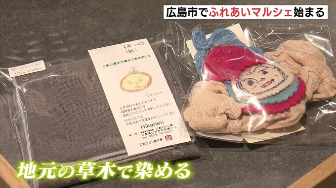 素朴な色合いのバックやハンカチは、廿日市市の事業所が、地元の草木で染めたものです。