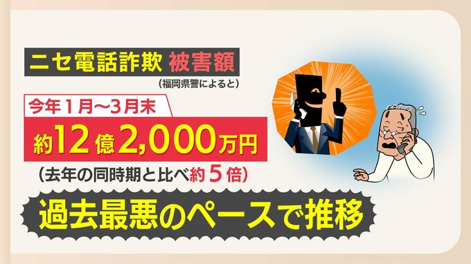 ニセ電話詐欺の被害が後を絶ちません。福岡県警のまとめによりますと今年に入って3月末までの被害金額は去年の5倍過去最悪の12億円に上っています。なぜこれほど多くの人が騙されるのでしょうか。福岡市南区に住む…